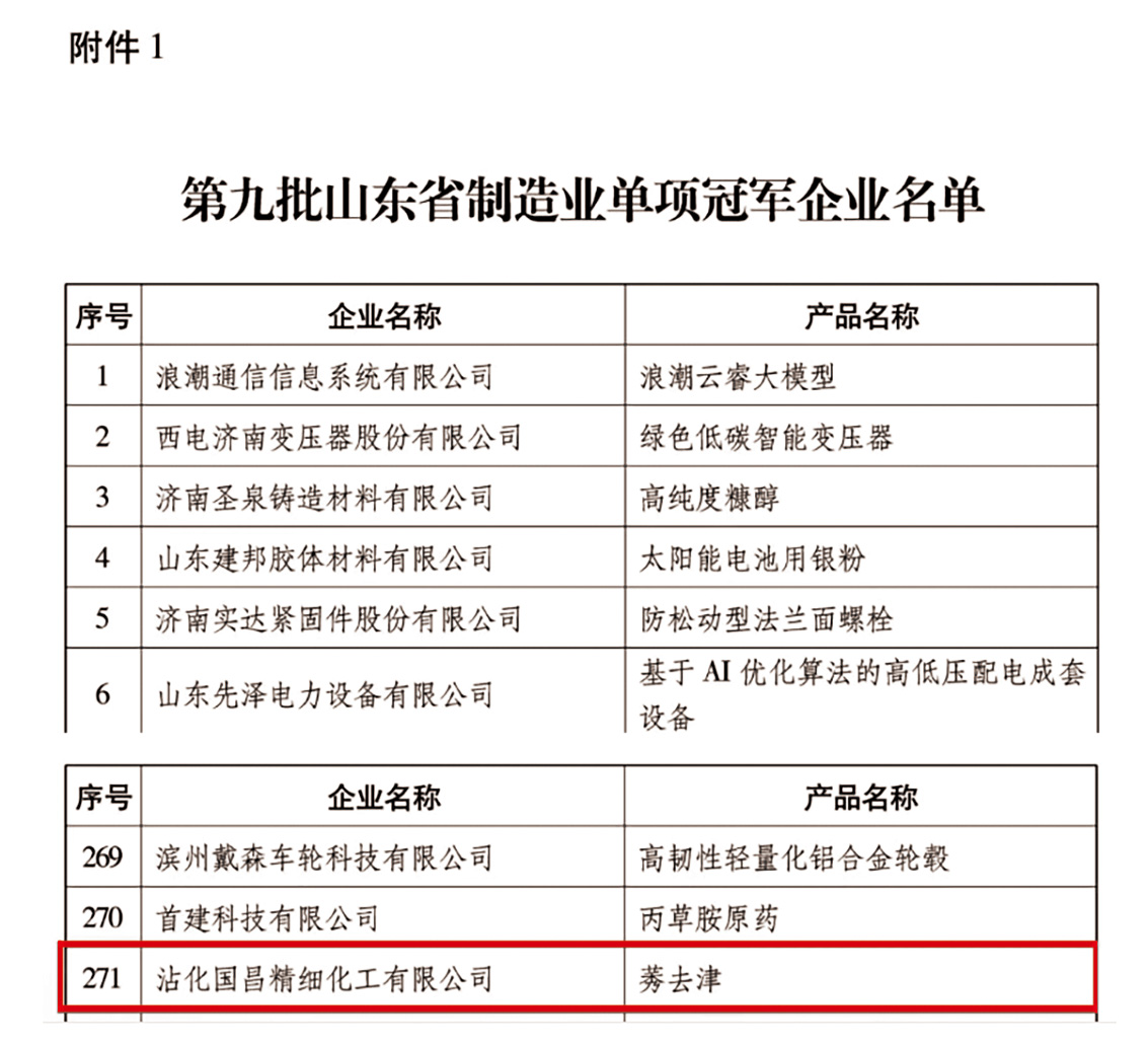 12月10日,山東省工業(yè)和信息化廳正式公布了第九批制造業(yè)單項(xiàng)冠軍企業(yè)名單,沾化國昌精細(xì)化工有限公司憑借核心產(chǎn)品 “莠去津”的突出表現(xiàn)成功入選。此次獲評(píng)標(biāo)志著企業(yè)在 “莠去津”這一細(xì)分領(lǐng)域已達(dá)到全省領(lǐng)先水平,在技術(shù)水平、市場(chǎng)占有率及品牌影響力方面獲得權(quán)威認(rèn)可。
