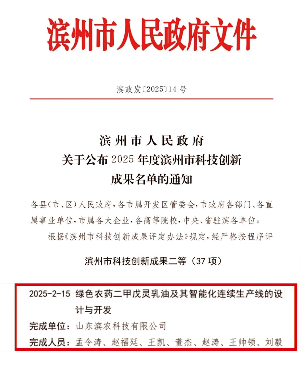 12月19日,濱州市人民政府公布了2025年度濱州市科技創(chuàng)新成果名單,我公司項(xiàng)目《綠色農(nóng)藥二甲戊靈乳油及其智能化連續(xù)生產(chǎn)線的設(shè)計(jì)與開發(fā)》榮獲二等獎(jiǎng)。該項(xiàng)目通過篩選出特殊高分子聚醚助劑為增效劑以及高效乳化劑,制得產(chǎn)品長期穩(wěn)定可靠,降低了能耗與污染,并集成智能生產(chǎn)線實(shí)現(xiàn)自動(dòng)化生產(chǎn),成為綠 色農(nóng)藥與智能制造融合的典范,對(duì)于推動(dòng)我國實(shí)現(xiàn)綠色生態(tài)農(nóng)業(yè)的目標(biāo)發(fā)揮了積極推動(dòng)作用。