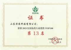 ■2021-06-19 濱農(nóng)科技榮獲“2021全國農(nóng)藥行業(yè)銷售TOP100”第十三名