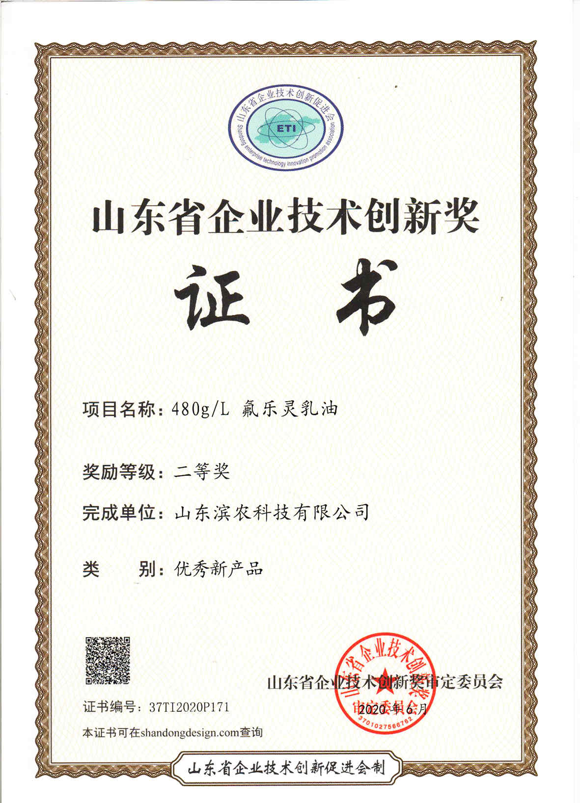 ■2020-08-05 我公司新產(chǎn)品480g/L氟樂靈乳油榮獲山東省企業(yè)技術(shù)創(chuàng)新獎優(yōu)秀新產(chǎn)品二等獎