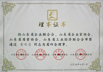 2009年7月1日,我公司董事長經(jīng)山東省企業(yè)聯(lián)合、山東省企業(yè)家協(xié)會、山東省質(zhì)量管理協(xié)會、山東省工業(yè)經(jīng)濟(jì)聯(lián)合會審察通過為省四會理事。