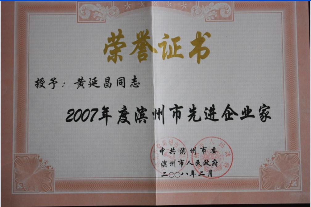 2008年2月,我公司董事長黃延昌被濱州市市委和濱州市人民政府評為2007年度“濱州市先進(jìn)企業(yè)家”。