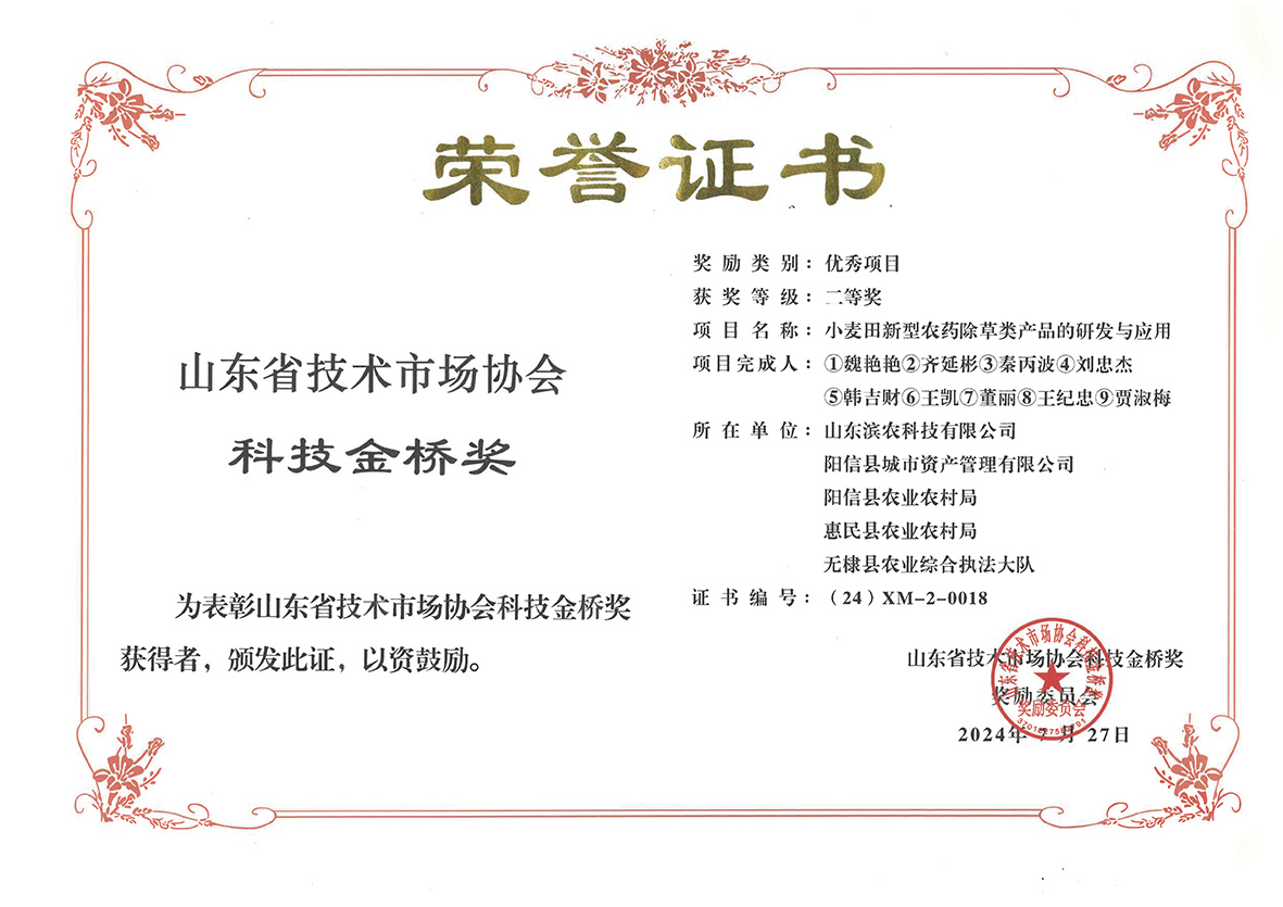 8月30日,2024年度山東省科技金橋獎(jiǎng)表彰獎(jiǎng)勵(lì)大會(huì)暨山東創(chuàng)新驅(qū)動(dòng)發(fā)展高端論壇在山東省干部學(xué)院舉行,各市科技局、省屬高??蒲性核止茇?fù)責(zé)人及獲獎(jiǎng)代表150余人參加。山東省技術(shù)市場協(xié)會(huì)副秘書長、總工辦主任蘇偉宣讀了《關(guān)于2024年度山東省技術(shù)市場協(xié)會(huì)科技金橋獎(jiǎng)獎(jiǎng)勵(lì)的決定》,我公司魏艷艷、劉忠杰、王凱、董麗、賈淑梅等完成的“小麥田新型農(nóng)藥除草類產(chǎn)品的研發(fā)與應(yīng)用”項(xiàng)目,憑借其卓越的創(chuàng)新性和廣泛的應(yīng)用價(jià)值,從眾多參選項(xiàng)目中脫穎而出,榮獲山東省技術(shù)市場協(xié)會(huì)科技金橋獎(jiǎng)優(yōu)秀項(xiàng)目二等獎(jiǎng)。