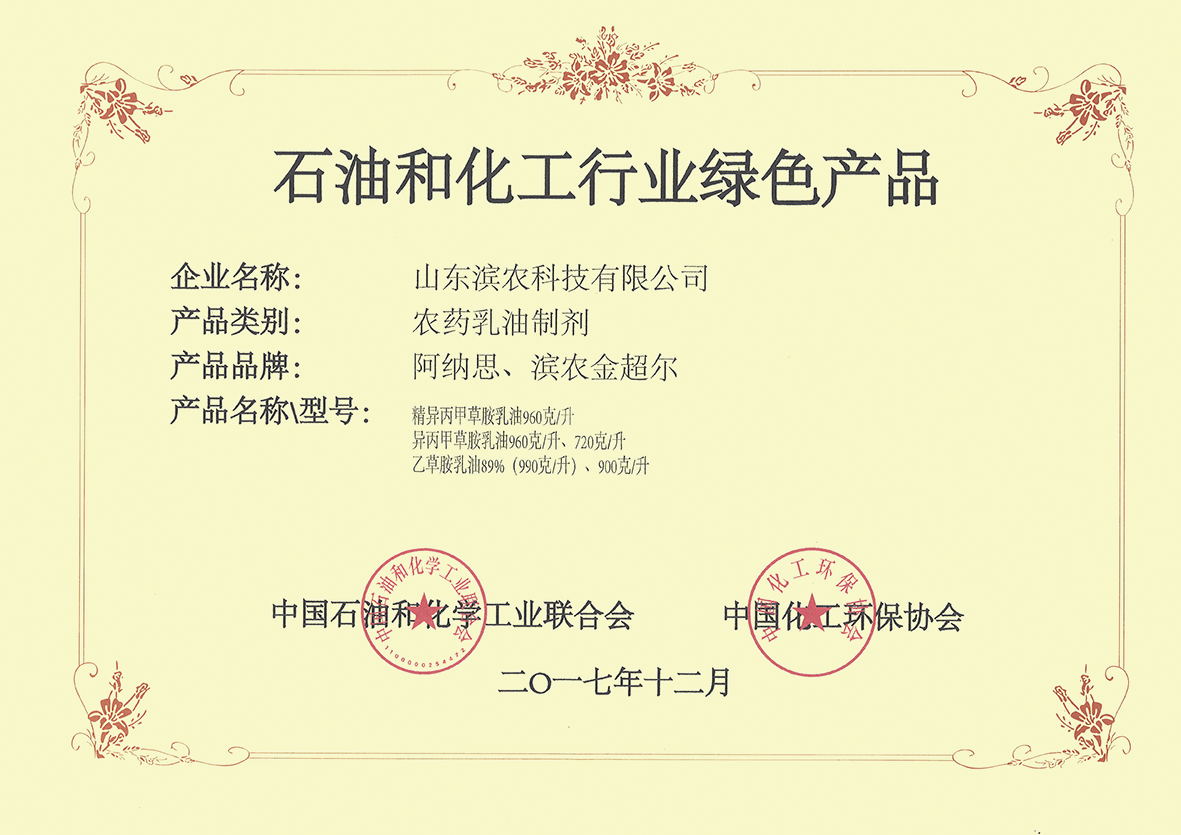 12月14日,由中國(guó)石油和化學(xué)工業(yè)聯(lián)合會(huì)和中國(guó)化工環(huán)保協(xié)會(huì)主辦的“2017年石油和化工行業(yè)綠色發(fā)展大會(huì)”在北京隆重召開,山東濱農(nóng)科技有限公司農(nóng)藥乳油制劑 “960 克/升精異丙甲草胺乳油”“960 克/升、720 克/升異丙甲草胺乳油”“89%(990 克/升)、900 克/升乙草胺乳油”等產(chǎn)品被認(rèn)定為“石油和化工行業(yè)綠色產(chǎn)品”并獲頒證書。