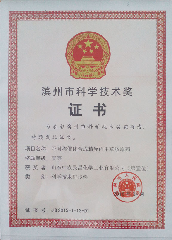 山東中農(nóng)民昌化學(xué)工業(yè)有限公司“不對(duì)稱催化合成精異丙甲草胺原藥”和“磺草酮·莠去津懸浮劑的開發(fā)及產(chǎn)業(yè)化”項(xiàng)目分別獲得濱州市科學(xué)技術(shù)進(jìn)步獎(jiǎng)一等獎(jiǎng)和三等獎(jiǎng),山東濱農(nóng)科技有限公司“新型油菜田除草劑二氯吡啶酸·烯草酮WP的開發(fā)研制”項(xiàng)目獲得濱州市科學(xué)技術(shù)進(jìn)步獎(jiǎng)三等獎(jiǎng)。