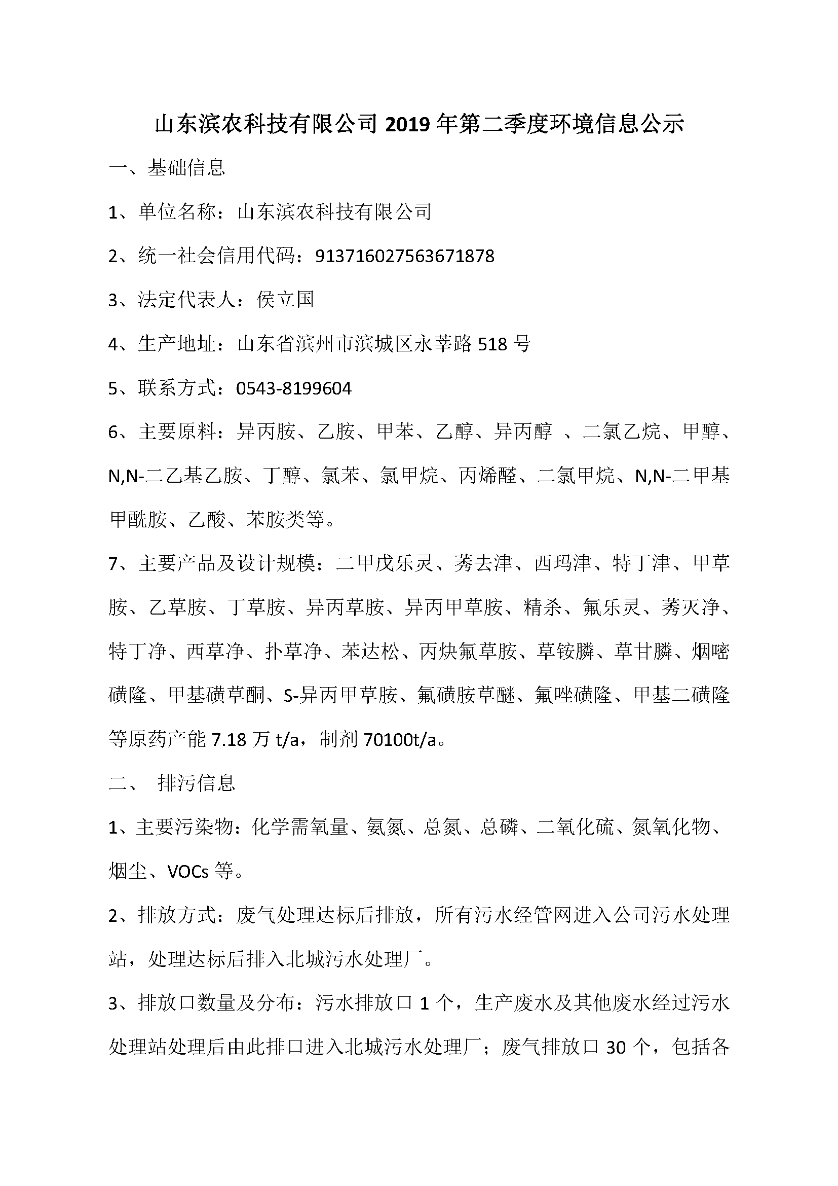 山東濱農(nóng)科技有限公司2019年第二季度環(huán)境信息公示