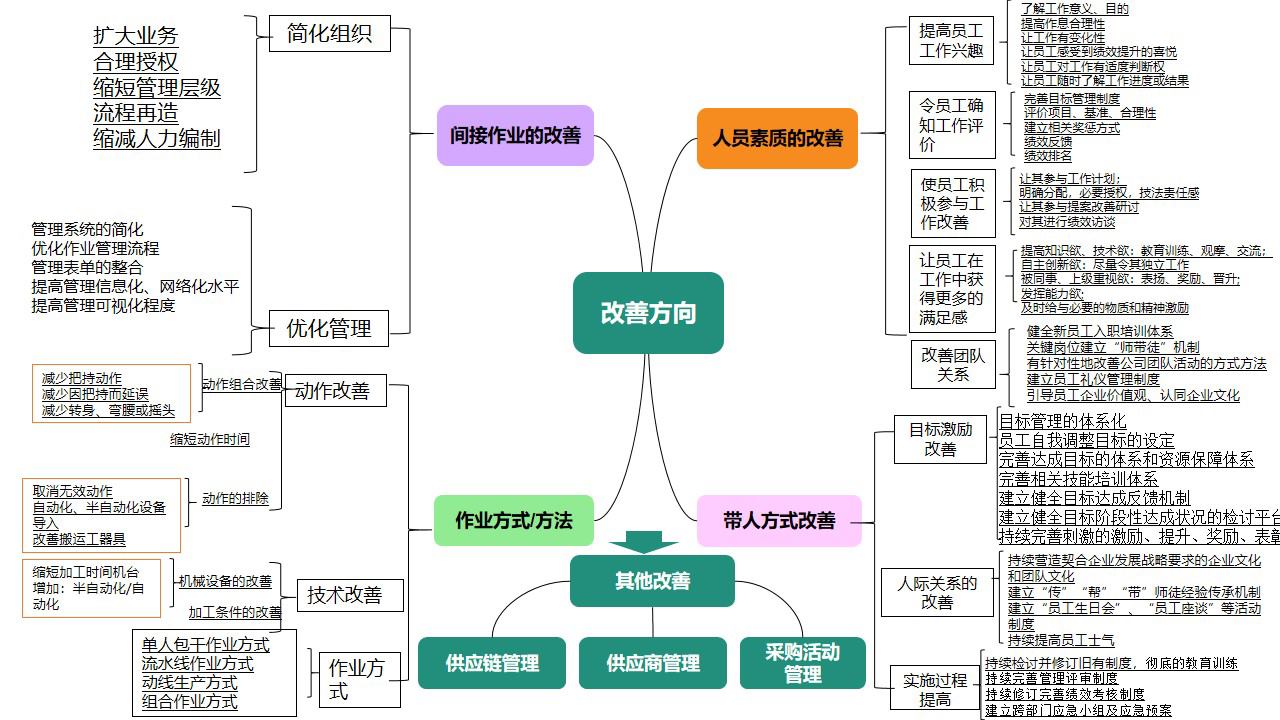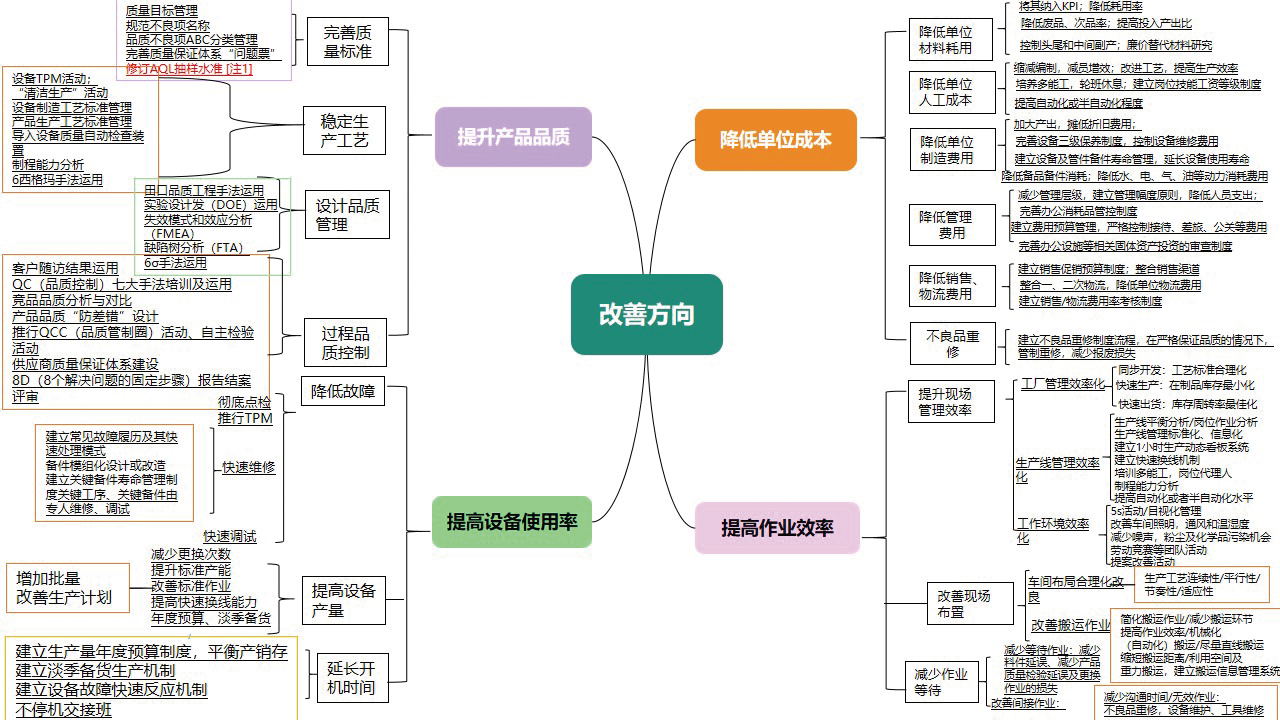 精益改善辦根據(jù)車間日常改善中遇到的問題,將改善方向匯總成思維導圖形式供大家參閱,改善方向重點從8個方面做了詳細闡述。針對設備管理方面如何進行改善,精益改善辦從公司精益管理微信群向大家定期發(fā)布《卓越班組TPM》知識,管理者可根據(jù)自己部門實際情況和班組長展開學習,從降低故障率、提高設備產(chǎn)量、延長開機時間等方面,與安全管理相結合,緊密溝通設備管理部門的日常管理工作,將設備管理工作落地實施并有效運行。