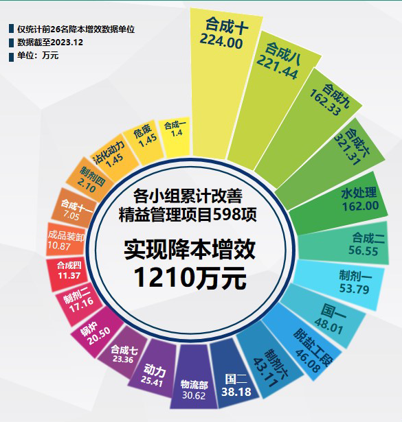 全年共計87個車間(部門)參與精益改善,濱州與沾化基地共評價改善項目598項,降本增效約1200余萬元。甘肅基地提交改善項目158項,降本增效551萬元。公司為鼓勵各系統(tǒng)參與改善,促使產(chǎn)品增值并快速實現(xiàn)產(chǎn)品價值、組織增效,共發(fā)放激勵基金58330元。各分管副總分別就2024年卓越推進(jìn)工作做了詳細(xì)要求,要求各改善團(tuán)隊展開改善項目盤點工作,借鑒優(yōu)秀,對標(biāo)持續(xù)改善,筑牢基礎(chǔ)管理工作。持續(xù)提質(zhì)提效,降工降費(fèi),節(jié)能減排;持續(xù)三化融合,使人機(jī)配合更高效,精益數(shù)字高賦能。細(xì)化績效指標(biāo)分解工作,將改善項目與部門績效、公司經(jīng)營目標(biāo)有效銜接。結(jié)合全年各改善團(tuán)隊參與情況及改善績效,以及各系統(tǒng)分管領(lǐng)導(dǎo)評定,公司評選出四個年度優(yōu)秀精益改善團(tuán)隊:制劑一車間、國一車間、合成七車間、危廢處理車間。