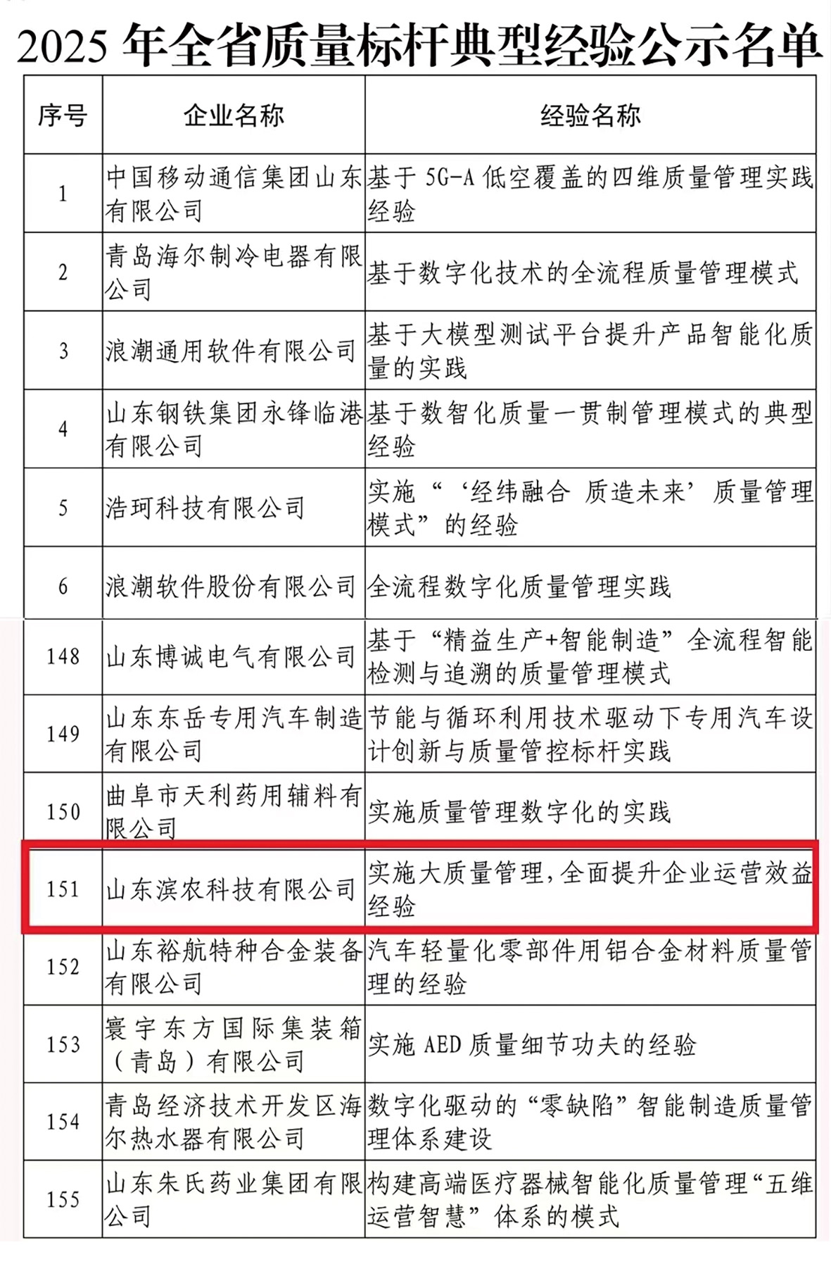 6月23日,山東省工業(yè)和信息化廳公布了2025年全省質量標桿典型經驗名單,我公司憑借“實施大質量管理,全面提升企業(yè)運營效益”的創(chuàng)新實踐成功入選。此次評選歷經企業(yè)申報、部門推薦和專家論證等多輪嚴格程序,全省共 155 家企業(yè)獲此殊榮,濱農科技作為農藥行業(yè)代表脫穎而出。
