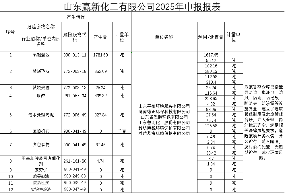 山東贏新化工有限公司2025年申報報表
