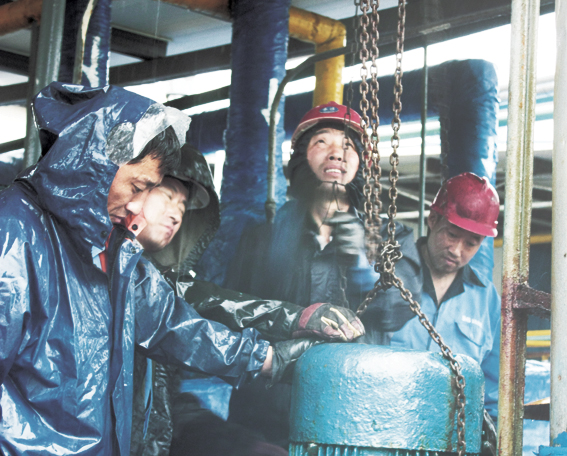 生產(chǎn)就是命令,當(dāng)動(dòng)力車間從生產(chǎn)反饋信息得知合三西瑪津生產(chǎn)受阻時(shí),車間迅速反應(yīng),利用7月26日盤點(diǎn)停車的間隙“見縫插針”更換供冷鹽水泵。可是天不作美,當(dāng)天,準(zhǔn)備換泵時(shí),大雨傾盆。而盤點(diǎn)空閑只有一個(gè)中午的空間,怎么辦?時(shí)間不等人,車間果斷決定:實(shí)施冒雨搶修。車間谷師傅、王師傅等師傅冒雨作業(yè),停電拉閘掛標(biāo)示,支龍門架,掛倒鏈,關(guān)閥門,拆螺栓……各項(xiàng)工作在大雨中有條不紊地進(jìn)行,譜寫了一曲雨中檢修進(jìn)行曲。截至中午11:30,終于將設(shè)備檢修完畢時(shí),師傅們的臉上流下的已分不清是汗水還是雨水。但分得清的是,看著高速運(yùn)轉(zhuǎn)的鹽水泵,大家臉上揚(yáng)起的是開心的笑容。