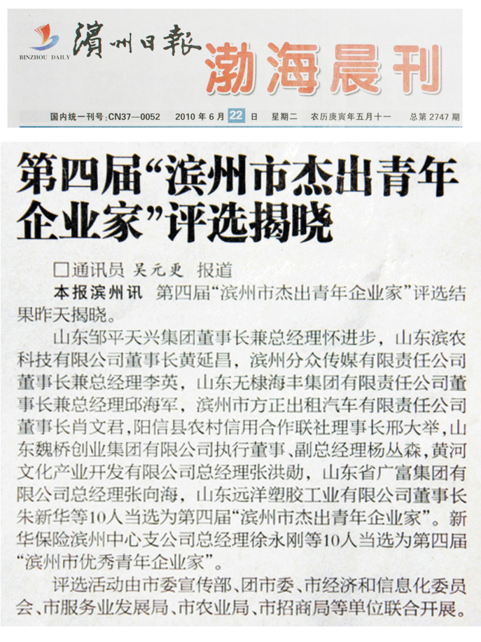 第四屆“濱州市杰出青年企業(yè)家”評選結(jié)果已于6月22日揭曉,我公司董事長黃延昌等10位優(yōu)秀企業(yè)家當(dāng)選為第四屆“濱州市杰出青年企業(yè)家”。評選活動(dòng)由市委宣傳部、團(tuán)市委、市經(jīng)濟(jì)和信息化委員會(huì)、市服務(wù)業(yè)發(fā)展局、市農(nóng)業(yè)局、市招商局等單位聯(lián)合開展。