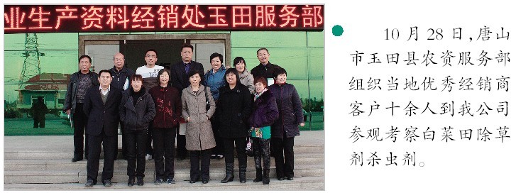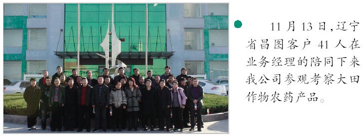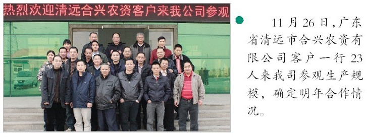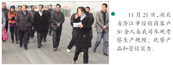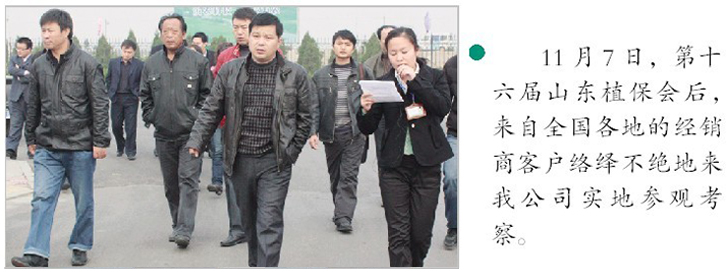 時(shí)間:2012-08-10 14:56隨著濱農(nóng)品牌美譽(yù)度的不斷提升,各地客戶對(duì)濱農(nóng)的認(rèn)同度不斷加深。初冬時(shí)節(jié),農(nóng)化市場(chǎng)進(jìn)入銷售淡季,全國(guó)各地經(jīng)銷商客戶紛紛慕名來(lái)我司參觀考察,意在全方位考察我公司生產(chǎn)實(shí)力、產(chǎn)品特色、新品上市等情況。公司解說(shuō)員張娜、常海燕、舒麗麗與公司隨行業(yè)務(wù)人員分別向一批批客戶介紹著濱農(nóng),并陪同客戶朋友們實(shí)地參觀制劑生產(chǎn)線、成品倉(cāng)庫(kù)、研究所等,及時(shí)向客戶解疑答惑。來(lái)訪客戶紛紛表示,通過(guò)參觀他們更真實(shí)的了解了濱農(nóng)的生產(chǎn)規(guī)模、產(chǎn)品結(jié)構(gòu)及綜合實(shí)力,與濱農(nóng)的合作前景更加廣闊,信心更加堅(jiān)定。
